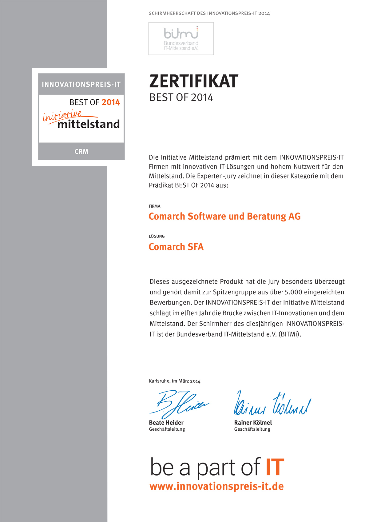 Comarch SFA solution to support sales processes received the award for the most innovative solutions in its class and received an award INNOVATIONSPREIS-IT 2014.